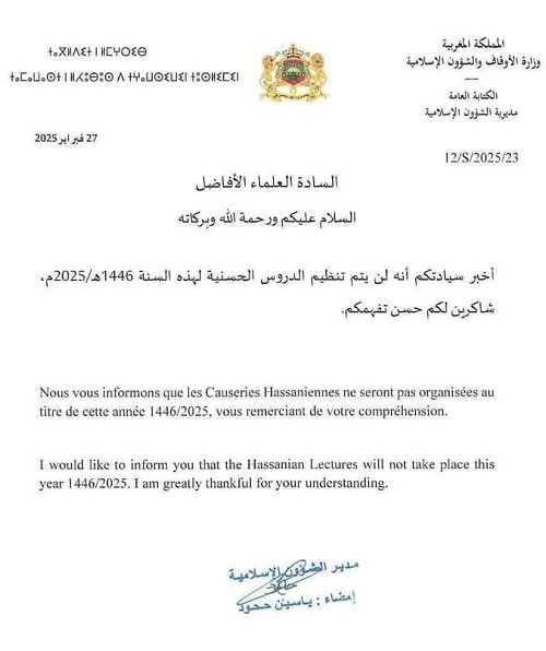 “وزارة الأوقاف” تعلن عدم تنظيم الدروس الحسنية في رمضان 1446هـ (وثيقة)