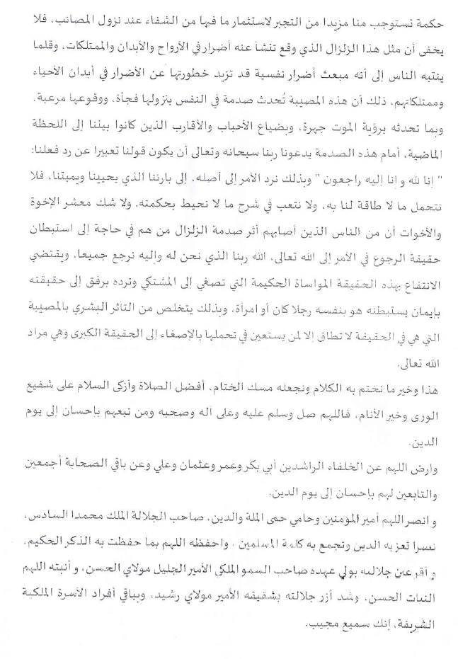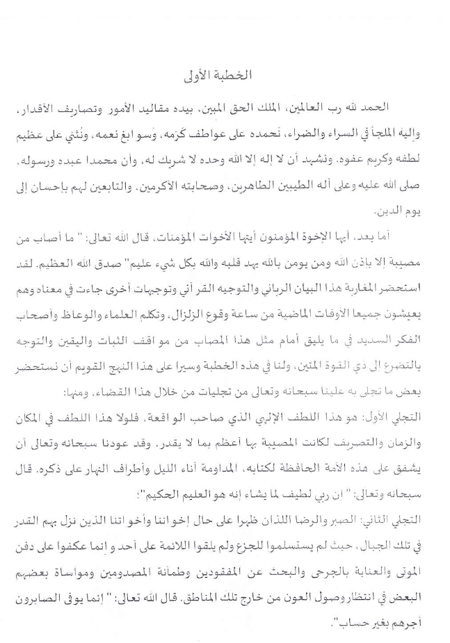 وقد خصصت الوزراة الخطبة لموضوع الزلزال الذي ضرب عددا من مناطق المغرب وخلف 2946 شهيد و5674 جريح.