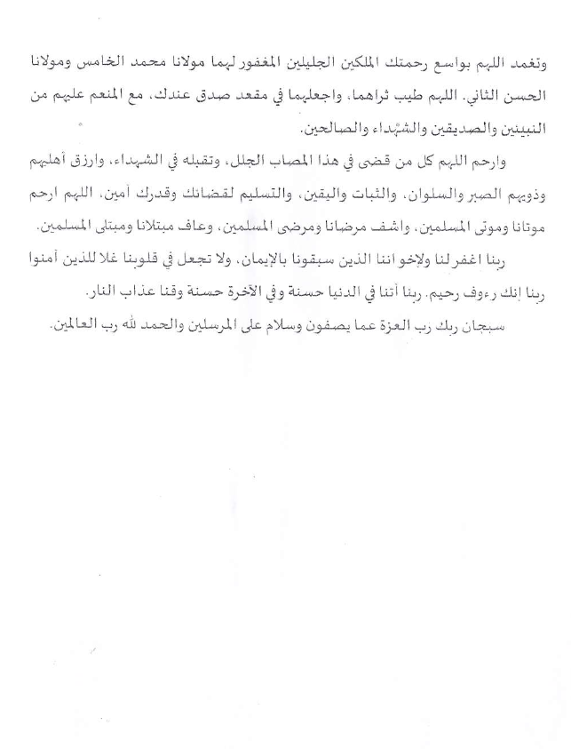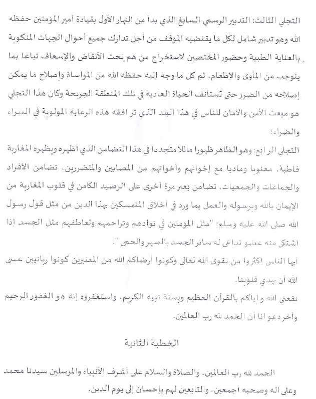هذا ودعت الخطبة إلى التأمل في تجليات الله التي تظهر من خلال هذا القضاء. ومن بين هذه التجليات، اللطف الإلهي الذي رافق الزلزال، والصبر والرضا الذي ظهر في حالة المنكوبين، والتدبير الرسمي الفعال الذي بدأ بقيادة الملك محمد السادس، وكذلك التضامن الروحي والمادي الذي أظهره ويظهره المغاربة جميعاً مع المصابين والمتضررين.