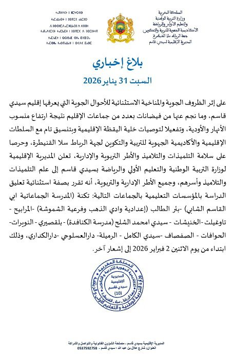 أعلنت المديرية الإقليمية لوزارة التربية الوطنية والتعليم الأولي والرياضة بسيدي قاسم تعليق الدراسة بالمؤسسات التعليمية وذلك ابتداء من يوم الاثنين 2 فبراير 2026 إلى إشعار آخر.
