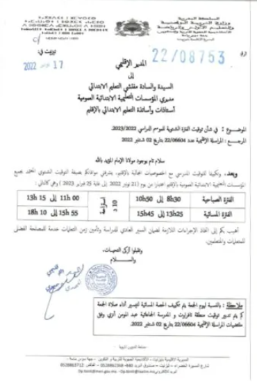 عدد 22/06604 بتاريخ 02 شتنبر 2022، حيث سيصبح موعد الفترات الصباحية من 8.30 إلى 10:50 صباحا، ومن الساعة 11:00 إلى 13:15 زوالا.