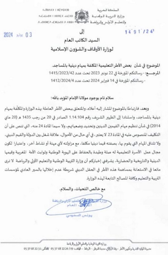 أصدرت وزارة التربية الوطنية والتعليم الأولي والرياضة مراسلة موجهة لوزارة الأوقاف والشؤون الإسلامية لا ترى فيها مانعا من تكليف أطرها من قبل وزارة الأوقاف بمهام دينية بالمساجد.