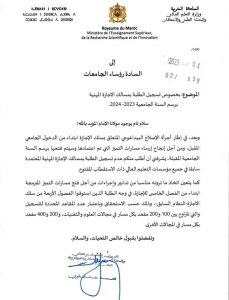 وجه وزير التعليم العالي، عبد اللطيف ميراوي، مراسلة إلى رؤساء الجامعات، بخصوص “تسجيل الطلبة بسلك الإجازة المهنية برسم السنة الجامعية 2023-2024”.