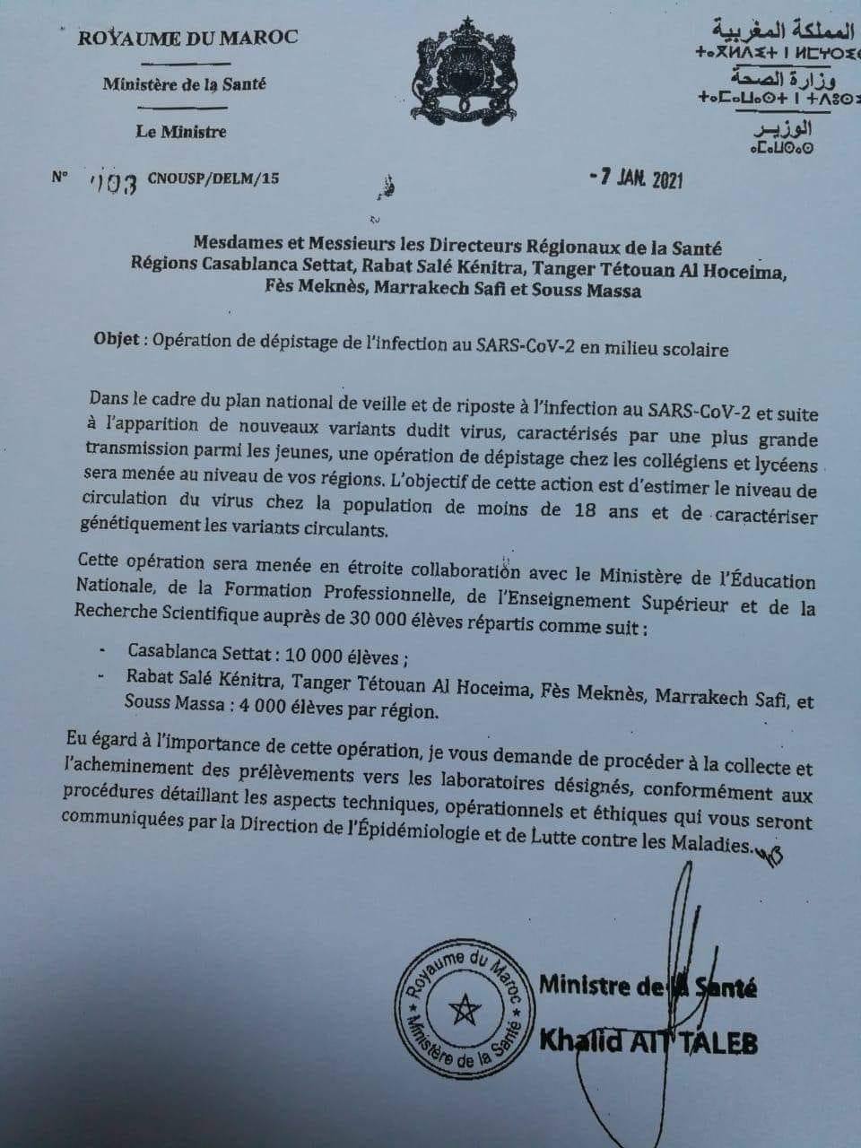 وأكدت الوزارة، في دورية موجهة إلى المديريين الجهويين للصحة، أنه في إطار المخطط الوطني للرصد والتصدي لفيروس كورونا المستجد، وعلى إثر ظهور سلاسة جديدة من هذا الفيروس، والتي تتميز بسرعة الانتشار بين الشباب، سيتم إجراء حملة للكشف تستهدف تلاميذ المستوى الإعدادي والثانوي بجهات الدار البيضاء-سطات، والرباط-سلا-القنيطرة، وطنجة-تطوان-الحسيمة، وفاس-مكناس، ومراكش-آسفي، وسوس – ماسة.