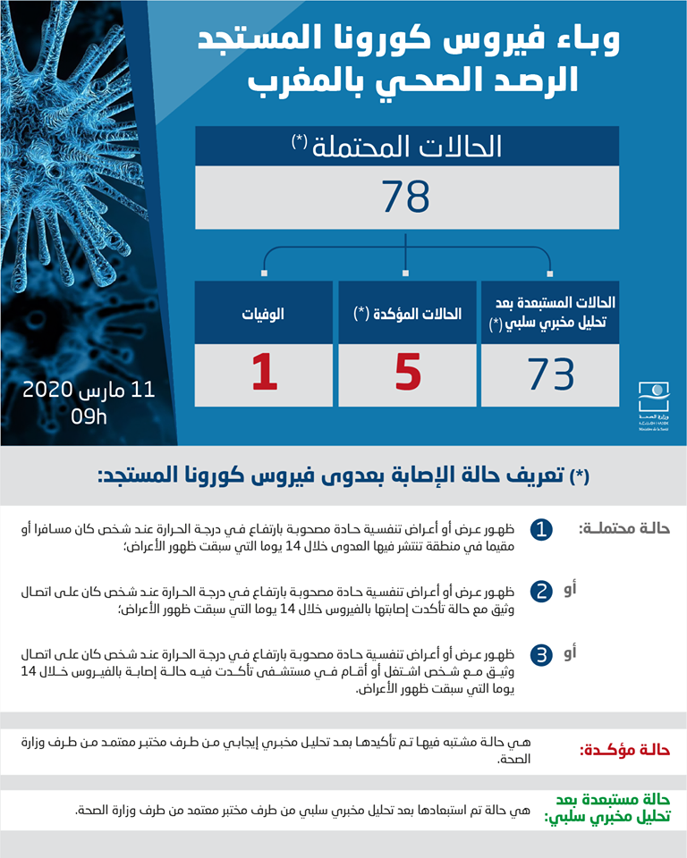أعلنت وزارة الصحة، اليوم الأربعاء على صفحتها الرسمية، عن إرتفاع عدد الحالات المحتمل إصابتها بفيروس كورونا بالمغرب إلى 78 شخصاً.
