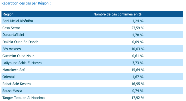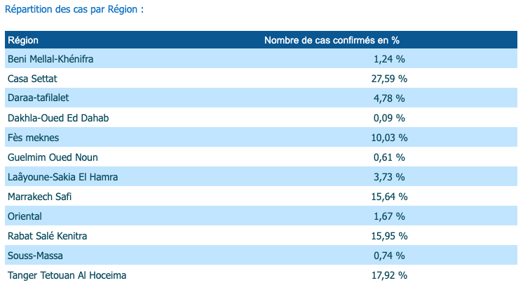 وبعد إعادة حساب النسب التي طرحتها الوزارة تبين أن مجموعها هو: 100,99، أي بزيادة 0,99 في المائة أي ما يساوي 121 حالة، وبعد أكثر من ساعة على نشره قامت الوزارة بتدارك ذلك، حيث تيبن أن هذه الزيادة كانت في جهة الرباط.