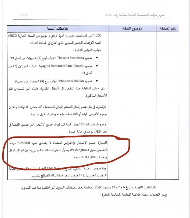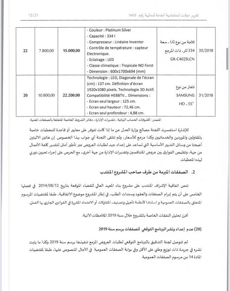 وكان تقرير المفتشية العامة للمالية، اكتشف وجود فوارق كبيرة بين المبالغ المالية المخصصة لاقتناء بعض المشتريات وأثمنتها الحقيقية، حيث اقتنت الوزارة طاولة للاجتماعات بمبلغ 75 مليون سنتيم، وخمس سلات للمهملات بثمن 6 آلاف درهم، في حين أن الثمن التقديري هو 3360 درهما، كما تم اقتناء ثلاجة بمبلغ 15 ألف درهم، في حين ثمنها التقديري لا يتعدى 7800 درهم، كما تم اقتناء جهاز تلفاز بمبلغ 22 ألف درهم، في حين لا يتعدى الثمن التقديري مبلغ 10800 درهم. كما وقفت اللجنة على غياب بعض الأشجار المقتناة في إطار صفقات، بثمن 6200 درهم لكل شجرة، في حين تم اقتناء شجرتي زيتون بمبلغ 36 ألف درهم لكل واحدة، ولاحظت لجنة الافتحاص غياب صورة كبيرة للملك وأخرى تعرضت للتكسير، تم اقتناؤها بمبلغ 3360 درهما.
