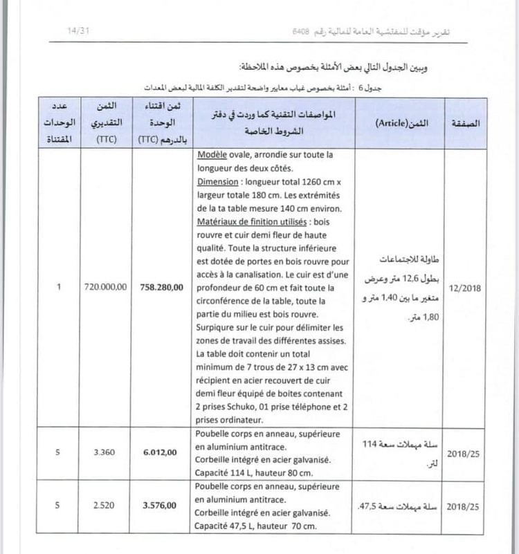 ولفتت المديرية إلى أنه في ما يتعلق بما أثير حول طاولة الاجتماعات (76 مليون سنتيم) فالأمر يتعلق “بطاولة مخصصة لقاعة الندوات والمؤتمرات وأن ثمن اقتناءها كان الأقل من بين باقي العروض التي تلقتها الوزارة، هذا مع العلم أن هذه التجهيزات تم اقتناؤها في إطار صفقات عمومية تشمل العديد من التوريدات الأخرى، وأن المفتشية العامة للمالية قد أكدت في تقريرها أن كل التجهيزات والتوريدات التي تم اقتناءها في إطار الصفقات تتواجد في عين المكان “.