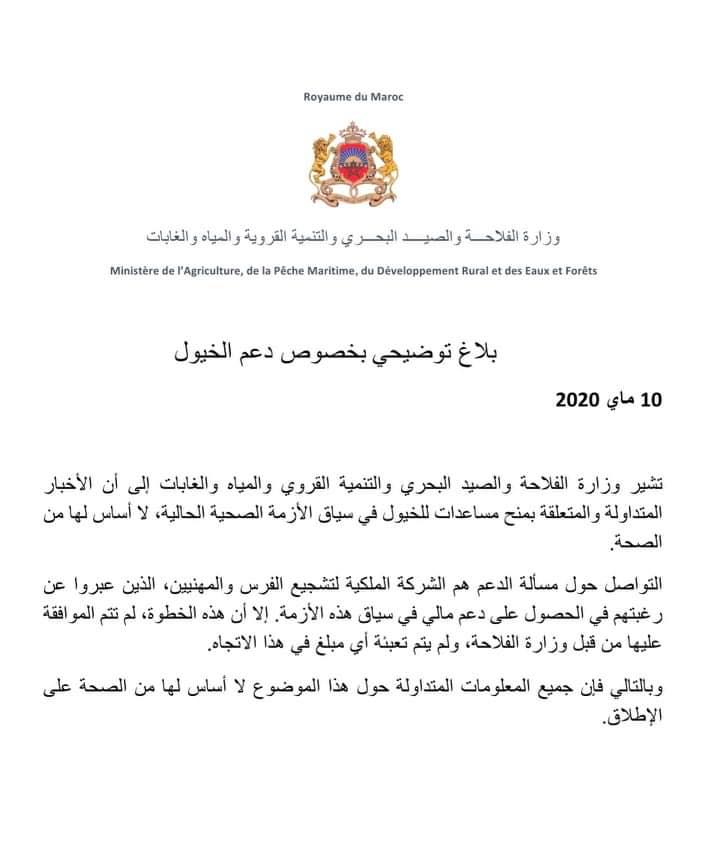 نفت وزارة الفلاحة والصيد البحري والتنمية القروي والمياه والغابات في بلاغ لها صحة الأخبار المتداولة والمتعلقة بمنح مساعدات للخيول في سياق الأزمة الصحية الحالية،.