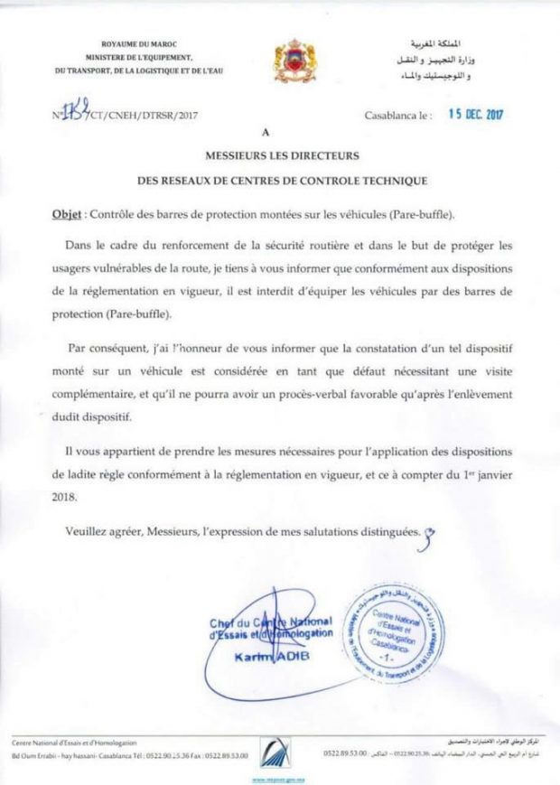 وحذرت الرسالة من أن تركيب هذه الواقيات مخالف للقانون، مبرزة أن المركبات التي تتوفر على هذه الواقيات يجب أن تخضع لمعاينة تكميلية، ولا يمكنها الحصول على شهادة المطابقة إلا بإزالة الواقي من الصدمات.