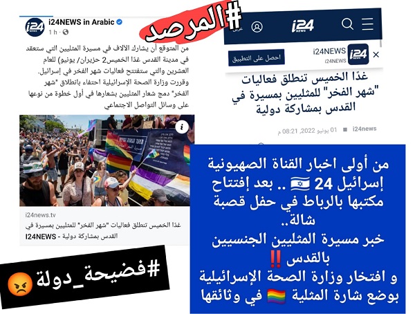 وبعد انطلاق القناة كشف الكاتب العام للمرصد المغربي لمناهضة التطبيع أن من أولى أخبارها “خبر مسيرة المثليين الجنسيين بالقدس‼️ وافتخار وزارة الصحة الإسرائيلية بوضع شارة المثلية في وثائقها”.