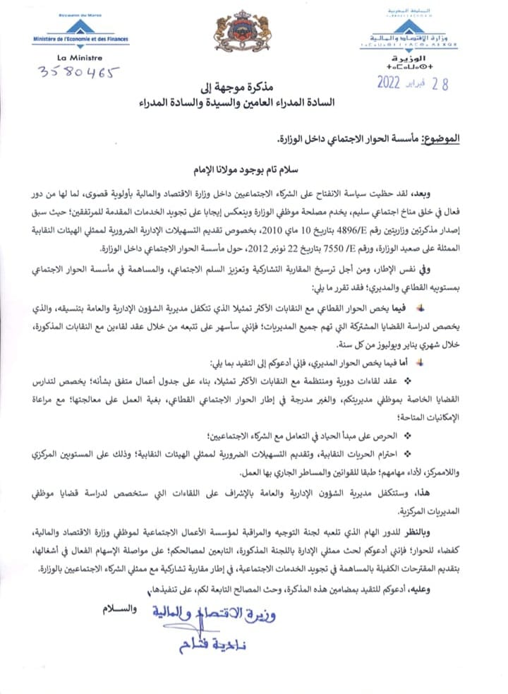 على إثر الاجتماع الذي عقدته وزيرة الاقتصاد والمالية، نادية فتاح العلوي، يوم 20 فبراير 2022، بحضور الوزير المنتدب ومدير الشؤون الإدارية والعامة ومدير مؤسسة الأعمال الاجتماعية، مع النقابات الأكثر تمثيلية، والذي أسفر عن مأسسة الحوار الاجتماعي، وجهت وزير الاقتصاد والمالية مذكرة إلى السادة المدراء العامين.