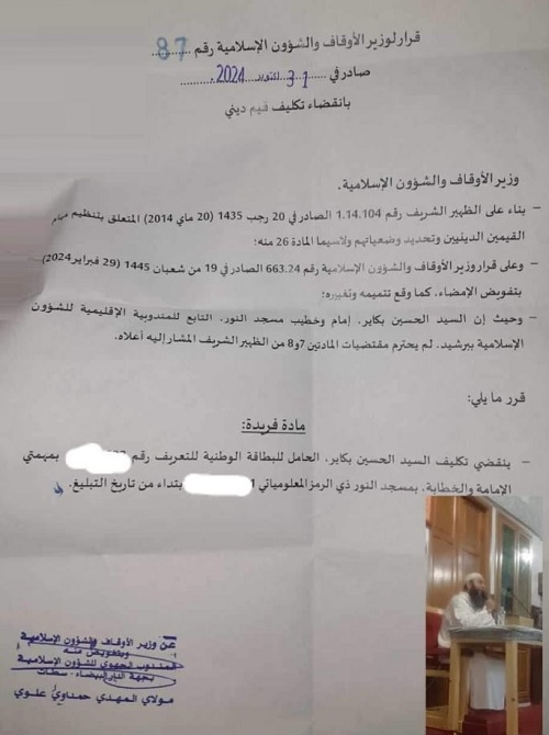 ينقضي تكليف السيد الحسين بكاير.. بمهمتي الإمامة والخطابة بمسجد النور ذي الرمز المعلوماتي.. ابتداء من تاريخ التبليغ”.