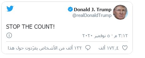 ونشر ترامب اليوم الخميس على حسابه في “تويتر” تغريدة قصيرة مؤلفة من ثلاث كلمات فقط،: “أوقفوا فرز الأصوات!”.