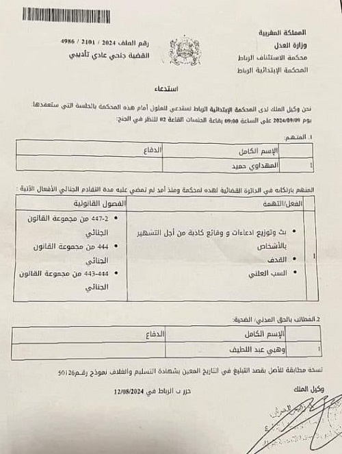 دعا وكيل الملك لدى المحكمة الابتدائية بالرباط الصحفي حميد المهداوي، مدير موقع “بديل”، إلى حضور المحكمة يوم التاسع شتتبر 2024 لأول جلسات الاستماع إليه، على خلفية شكاية تقدم بها عبد اللطيف وهبي، وزير العدل والأمين العام السابق لحزب الأصالة والمعاصرة.