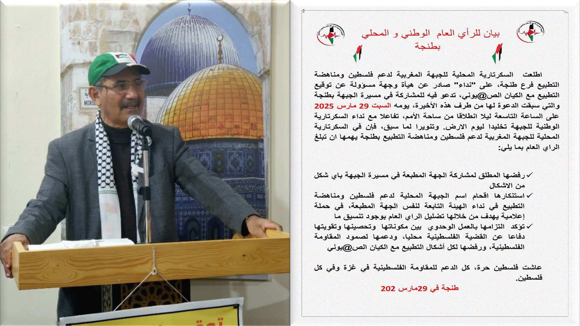 تجدر الإشارة إلى أن السكرتارية المحلية للجبهة المغربية لدعم فلسطين ومناهضة التطبيع – فرع طنجة كانت قد أصدرت بيانا مثيرا عبرت عبرت من خلاله عن رفضها المطلق لمشاركة أي جهة “مطبعة مع الكيان الصهيوني” في المسيرة التي دعت إليها الجبهة تخليدًا ليوم الأرض، والتي كانت مقررة مساء أمس السبت 29 مارس 2025 على الساعة التاسعة ليلا بساحة الأمم، في إشارة واضحة إلى المبادرة المغربية للدعم والنصرة التابعة لحزب العدالة والتنمية، الذي وقع أمينه العام السابق ورئيس الحكومة آنذاك سعد الدين العثماني عن الاتفاق الثلاثي بين المغرب وأمريكا وإسرائيل، وهو الاتفاق الذي أعاد تطبيع العلاقات الدبلوماسية بين المغرب والكيان الصهيوني الغاصب.