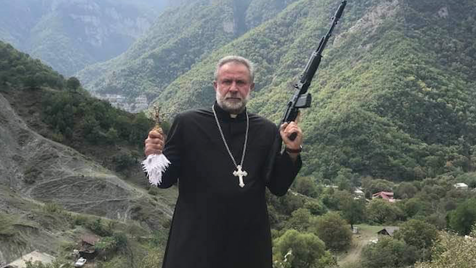 قامت الخارجية الأرمينية اليوم الأحد 27 شتنبر، بنشر صورة لرجل يرتدي لباس قسيس مسيحي وعليه الصليب رافعاً السلاح.