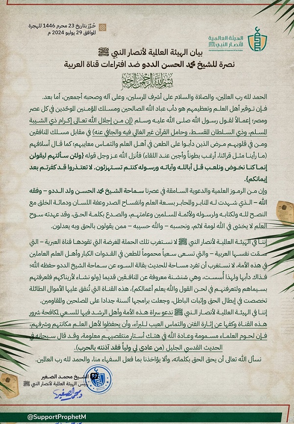 بيان الهيئة العالمية لأنصار النبي ﷺ نصرة للشيخ محمد الحسن الددو ضد افتراءات قناة العربية