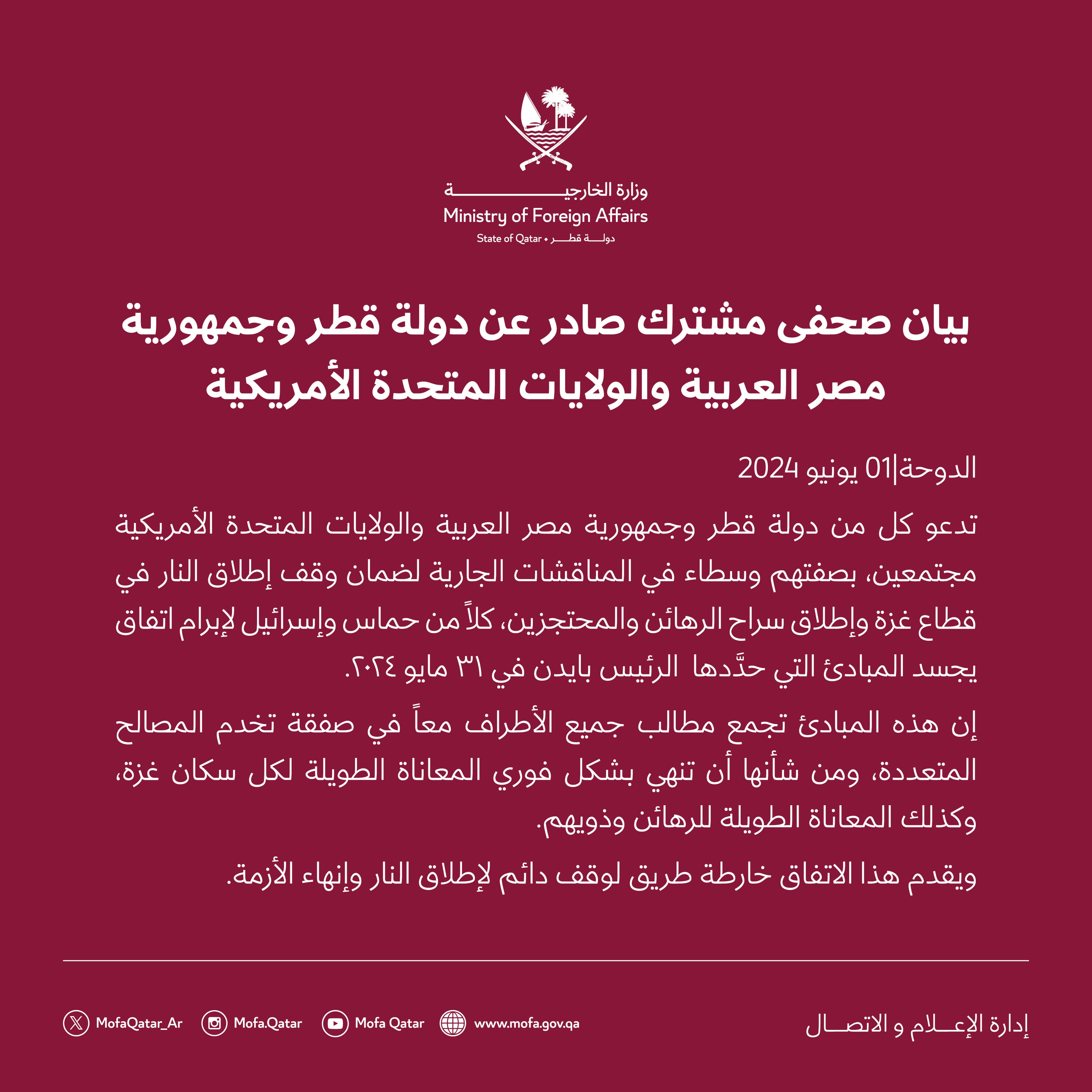 وقالت الخارجية القطرية في البيان: “تدعو كل من قطر ومصر والولايات المتحدة مجتمعين بصفتهم وسطاء في المناقشات الجارية لضمان وقف إطلاق النار في قطاع غزة وإطلاق سراح الرهائن والمحتجزين، كلا من حماس وإسرائيل لإبرام اتفاق يجسد المبادئ التي حددها الرئيس بايدن في 31 مايو 2024”.
