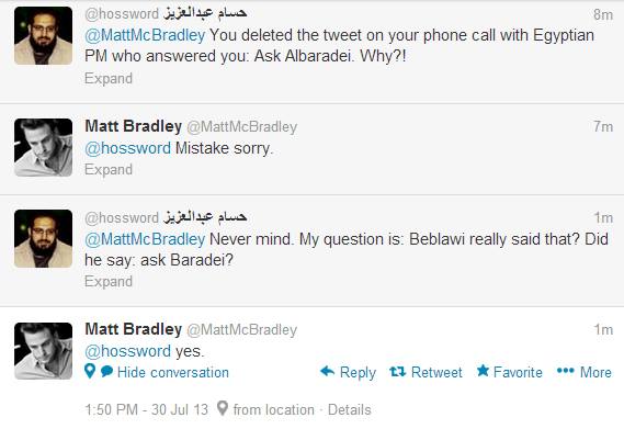 وفي جانب آخر فإن مراسل “وول ستريت جورنال” بالشرق الأوسط كتب تغريدة، قال فيها: “في اتصال هاتفي اليوم (29 يوليوز) برئيس الحكومة المصري حازم الببلاوي سألته هل ستلتقي آشتون مرسي الليلة؟ فقال لي: لا أدري، اسأل البرادعي”.