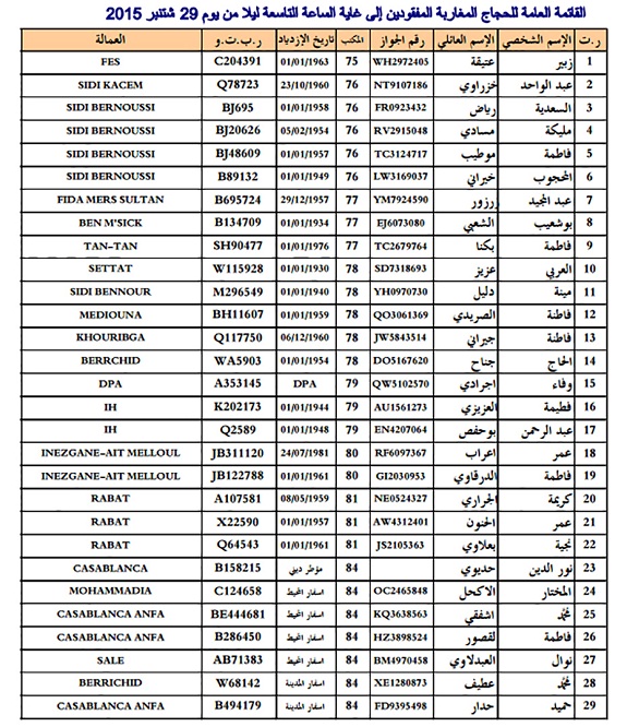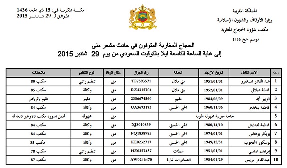 وفيما يلي اللوائح الكاملة والنهائية والرسمية للحجاج المغاربة المتوفين والجرحى والمفقودين: