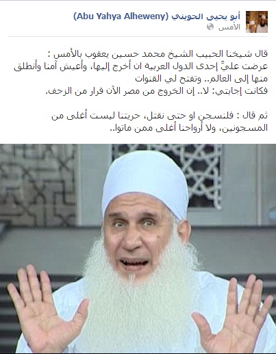 فقد نشر ابن الشيخ أبي إسحاق الحويني، في صفحته على “الفيسبوك”، أمس الأربعاء: قال شيخنا الحبيب الشيخ محمد حسين يعقوب :”عرضت عليَّ إحدى الدول العربية أن أخرج إليها، وأعيش آمنا وأنطلق منها إلى العالم.. وتفتح لي القنوات، فكانت إجابتي: لا.. إن الخروج من مصر اﻵن فرار من الزحف“.