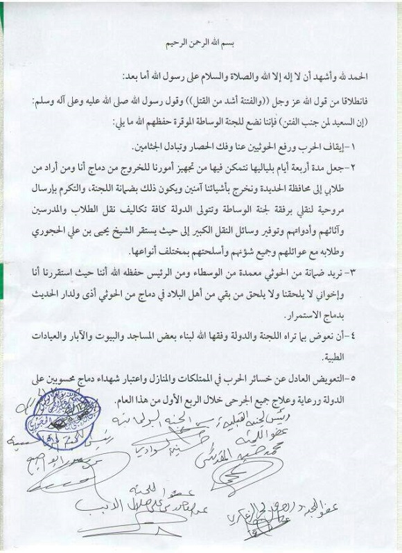 كما يدعو البيان (مرفق مع الخبر)، الذي يأتي في إطار اتفاق إنهاء المعارك، الحوثي إلى إعطاء ضمانة معمدة من الوسطاء ومن الرئيس عبد ربه منصور هادي بعدم تعرض الحوثي بالأذى لأهل دماج ولدار الحديث وطلبتها.