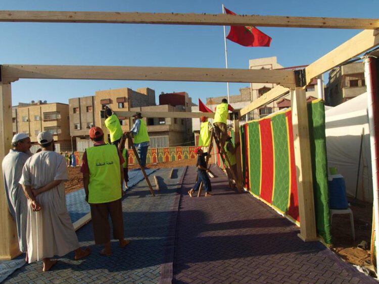 مجهودات كبيرة يقوم بها المشرفون على المصلى، لإخراج هذا العمل الجبار إلى أرض الواقع؛ احتاج منهم شهرا من الجهد المضني، بمشاركة أفراد طاقم التنظيم المتطوعين، وإعانة الجماعة والبلدية التي أمدتهم ببعض الأدوات والآليات التي عملت على تسوية أرضية المصلى، ورشها بالمياه على مدار أيام حتى استوت على ما هي عليه الآن، كما صرح بذلك المشرف العام على تنظيم المصلى السيد جمال بنعكراش لهوية بريس.