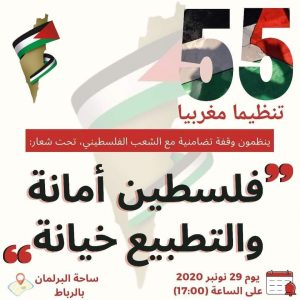 وجاء في دعوة الهيئة “بمناسبة اليوم العالمي للتضامن مع الشعب الفلسطيني الأبي، ودعما لصمود الفلسطيينيبن، ورفضا لكل المخططات التي تحاك من أجل تصفية القضية؛ تدعو الهيئة المغربية لنصرة قضايا الأمة الشعب المغربي وكل الهيئات المهتمة إلى المشاركة في الوقفة التخليدية للمناسبة يوم الأحد 29 نوفمبر 2020، والتي ستشارك فيها 55 هيئة مغربية، تحت شعار “فلسطين أمانة والتطبيع خيانة” على الساعة الخامسة مساء أمام ساحة البرلمان بالرباط”.