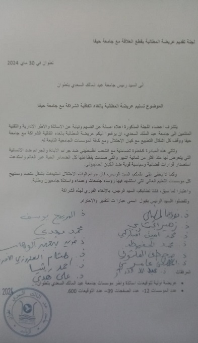 وقع أول أمس الخميس (30 ماي 2024) نحو 600 من أعضاء هيئة التدريس والأطر الإدارية بجامعة عبد المالك السعدي بتطوان، على عريضة موجهة إلى رئيس الجامعة، مطالبين إياه بإلغاء اتفاقية شراكة مع جامعة “حيفا” الإسرائيلية.