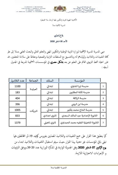 أنهت المديرية الإقليمية لوزارة التربية الوطنية وتكوين المهني والتعليم العالي والبحث العلمي بمدينة سلا إلى علم كافة التلاميذ والتلميذات وأوليائهم أنه بالتنسيق مع السلطات الترابية والصحية، وحفاظا على سلامة المتعلمين قد تقرر اعتماد النمط التربوي القائم على “التعليم عن بعد” بشكل حصري في المؤسسات التعليمية المدرجة في الجدول أسفله.