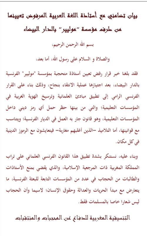 ويأتي هذا البيان إثر رفض تعيين أستاذة محتجبة بمؤسسة “موليير” الفرنسية بالدار البيضاء بعد اجتيازها عملية الانتقاء بنجاح.