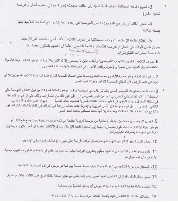 وفي إحدى الشكايات التي توصل بها موقعنا (انظر الصورة أعلاه) يتحدث أولياء التلاميذ عن العديد من الخروقات بحق أولادهم، ومنها: تحويل المدير لقاعة المطالعة إلى مكتب خاص به؛ وحجز الكتب والمراجع عن التلاميذ، ومنعهم من الاستفادة منها؛ وإغلاق قاعة الإعلاميات، وحرمان التلاميذ من ولوجها؛ بل وصل الشطط والتعسف بهذا المدير -حسب الشكاية- حد ضرب التلاميذ وشتمهم بألفاظ عنصرية، مما خلف استياء كبيرا لدى التلاميذ وأوليائهم، متسائلين: متى تقوم السلطات بردع هذا المدير وتأديبه؟