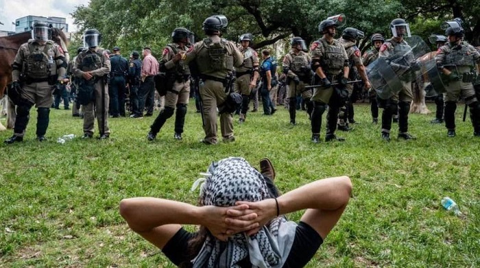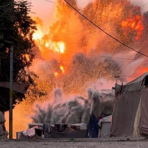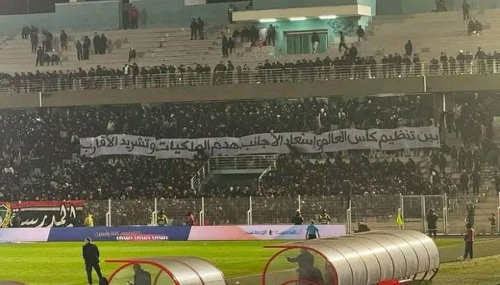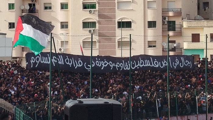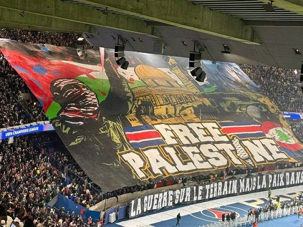 هوية بريس – متابعة جماهير الفريق الفرنسي باريس سان جيرمان ترفع يافطة داعمة لفلسطين خلال مباراة فريقهم مع الفريق الإسباني أتليتكو مدريد.