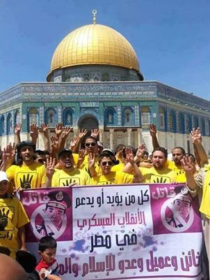 تظاهرة ضد الانقلاب العسكري في مصر على الرئيس الشرعي محمد مرسي بباحة المسجد الأقصى قبالة قبة الصخرة، وهي بصبغة شارة النصر بأربعة أصابع..