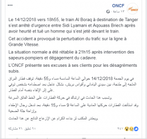 أثار بيان على الصفحة الرسمية لمكتب قطارات لخليع، على إثر حادث وفاة مواطن مغربي بمدينة “أصيلة” جراء حادث أليم تسبب به “البراق”، بعد أقل من أسبوعين على حادث مماثل في “عين عتيق”. غضب واستياء رواد الفيسبوك.